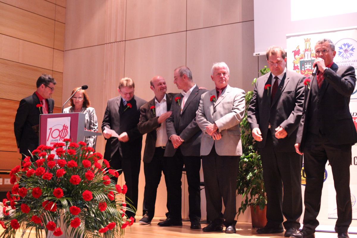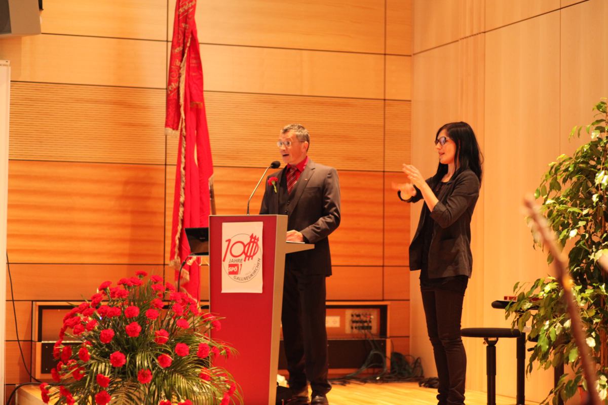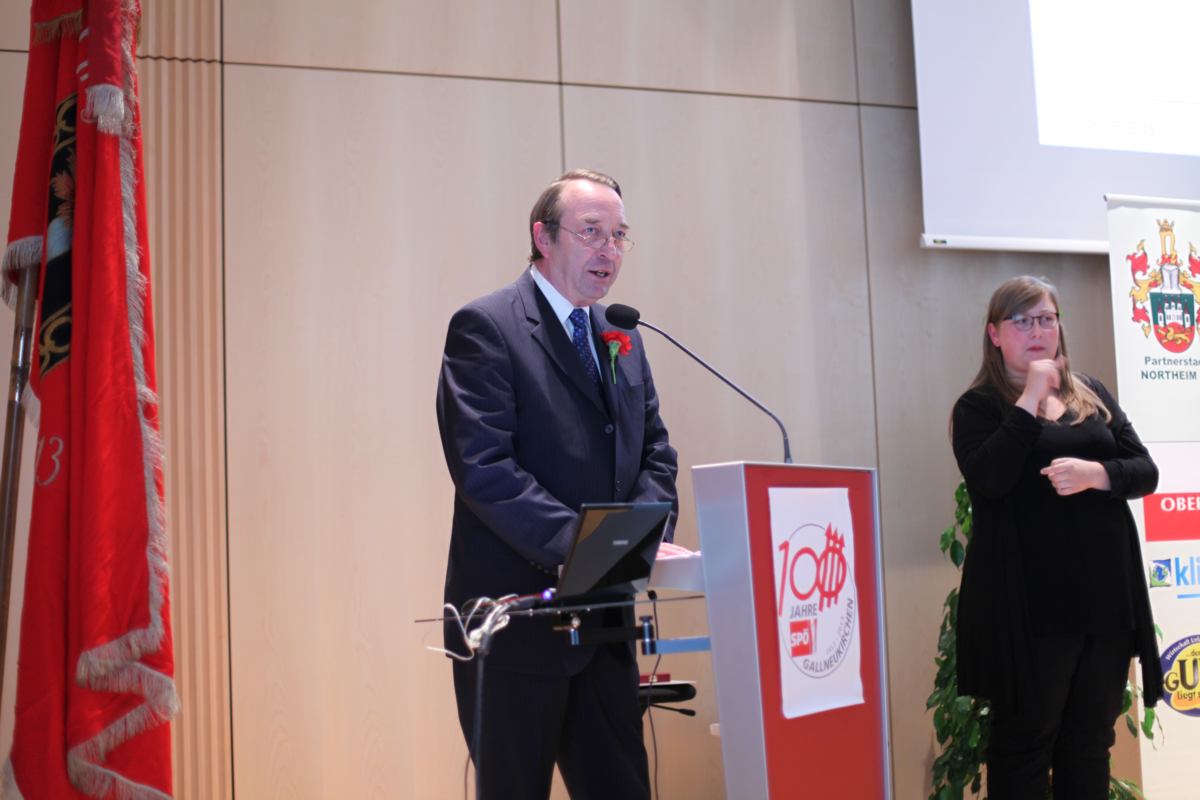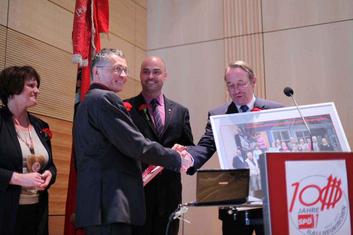Stadtparteivorsitzender Martin Seidl durfte Gesundheitsminister Alois Stöger und eine große Abordnung der SPD Northeim, Gallneukirchens Partnerstadt, begrüßen. Das unwirtliche Wetter hielt viele Mitglieder und Sympathisanten nicht davon ab, am folgenden Festzug zur Landesmusikschule teilzunehmen, in welcher der eigentliche Festakt stattfand. Hier gab es vor über 200 Gästen ein buntes Programm, bei dem die Geschichte der SPÖ Gallneukirchen Revue passieren gelassen wurde. Neben Bundesminister Stöger waren auch Landesrat Reinhold Entholzer und der scheidende Bezirksvorsitzende Josef Eidenberger anwesend, die in ihren Ansprachen auf die Rolle der Sozialdemokratie für die Lebensbedingungen der Menschen in den letzten 100 Jahren im Allgemeinen und die Bedeutung der SPÖ Gallneukirchen im Mühlviertel im Besonderen eingingen. Nach historischen Streifzügen erhielten Wilhelm Heidinger und Hans Karl die Viktor-Adler-Plakette für ihre langjährige Tätigkeit und Mitgliedschaft in der SPÖ. Langzeitvorsitzender Fritz Wurm wurde für seine 21jährige Vorsitzführung ebenfalls geehrt. Weiters wurde die knapp 150-seitige Festschrift und die Sondermarke zum 100-Jahr-Jubiläum vorgestellt. Umrahmt wurde das Programm von einer jungen Band, die in einer pfiffigen Zusammenstellung moderner und traditioneller Nummern das Publikum begeisterte.